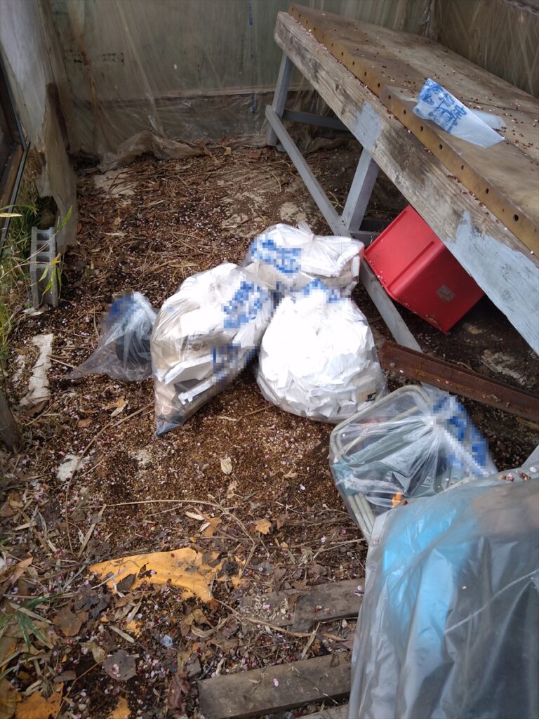 ベニヤ板の処理後、温室内へ戻り 発泡スチロールやその他のゴミ を45L袋に詰めていきました。