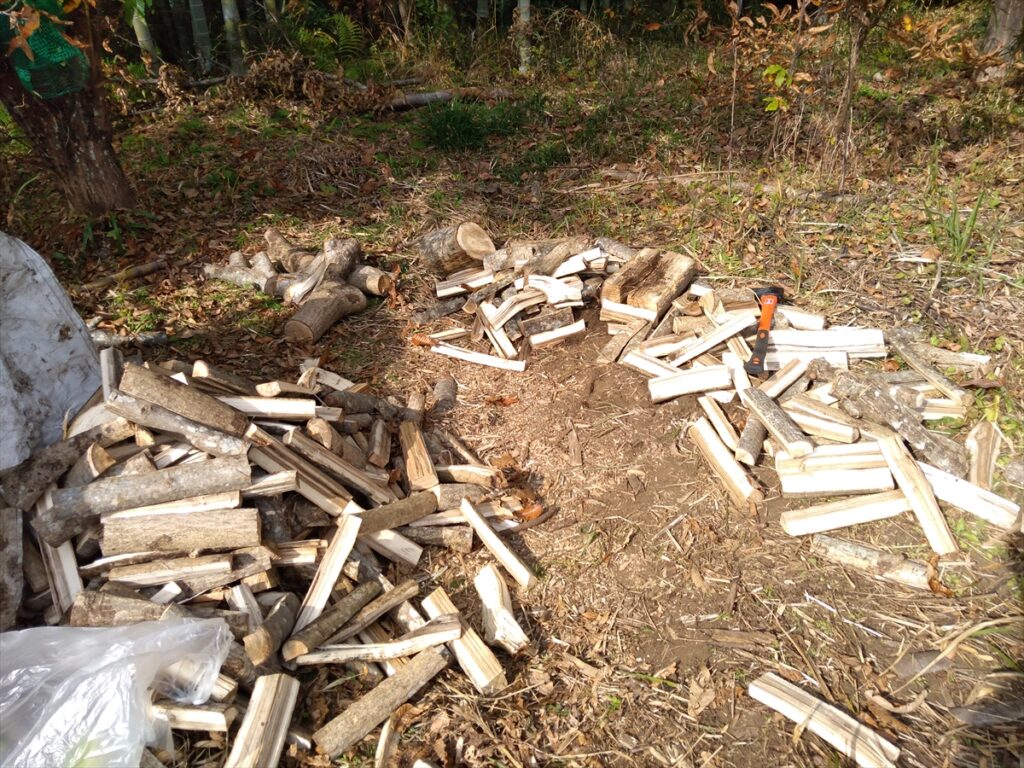 処分するには惜しいほどの量と硬さだったので、薪として再利用することにした。クルミは硬くて火持ちが良く、薪としては意外と優秀らしい。しばらく日陰で乾燥させてから割ることにした。